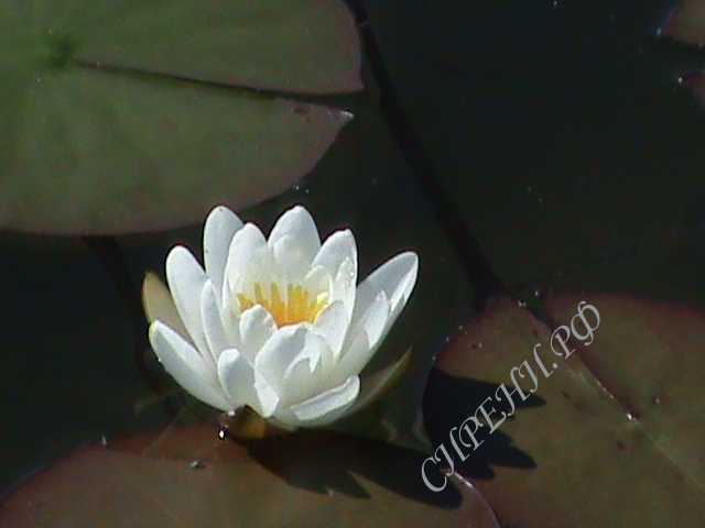 Крупная нимфея.Диаметр белоснежного цветка 10-12 см.Обильное цветение начинается в 20-х числах июня и продолжается 1-1,5 месяца.Крупные цветки расположены поверх зеленых плотных листьев. |