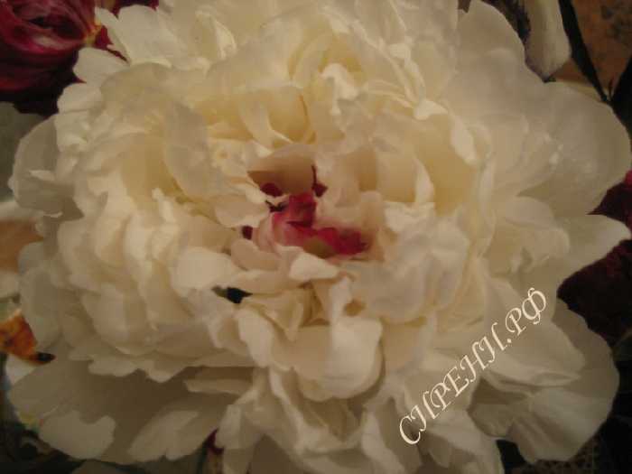 • Фестива Максима (Пион) Заказать Фото: 1 2 3 4 Очень крупные белые махровые цветы с несколькими темно красными лепестками в центре. |