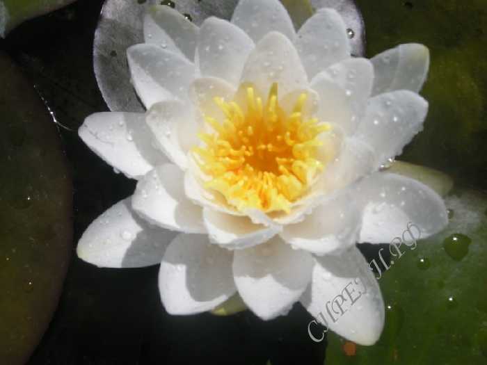 Крупная нимфея.Диаметр белоснежного цветка 10-12 см.Обильное цветение начинается в 20-х числах июня и продолжается 1-1,5 месяца.Крупные цветки расположены поверх зеленых плотных листьев. |